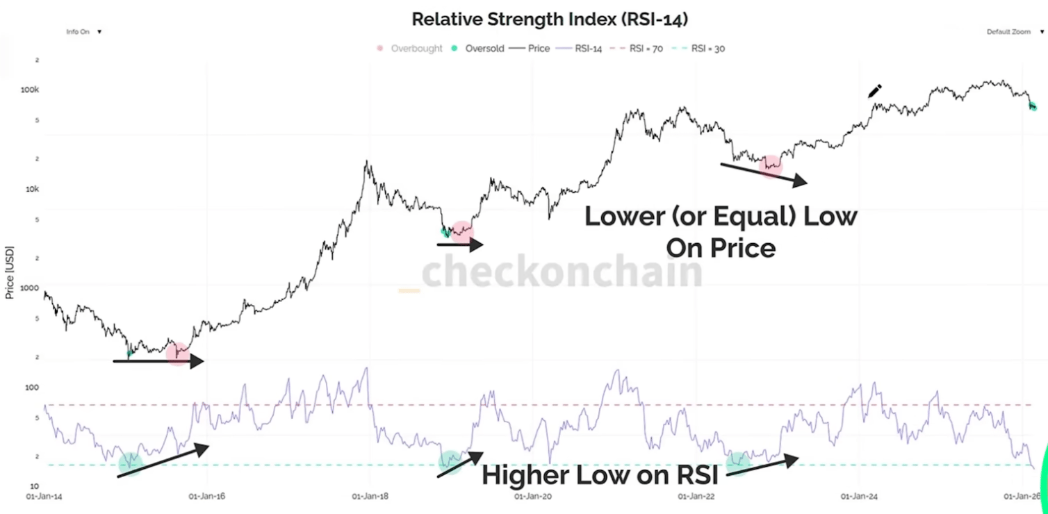 Toda vez que o RSI (Índice de Força Relativa) no semanal do Bitcoin atinge determinadas faixas de sobrevenda, historicamente estamos próximos do fundo.