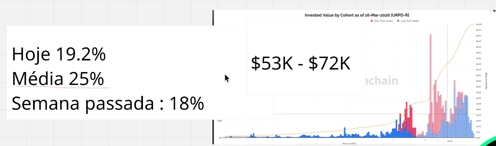 O indicador de base de oferta mostra que, nos ciclos anteriores, o fundo do mercado foi encontrado quando cerca de 25% dos investidores tinham preço médio dentro de uma determinada faixa de preço.