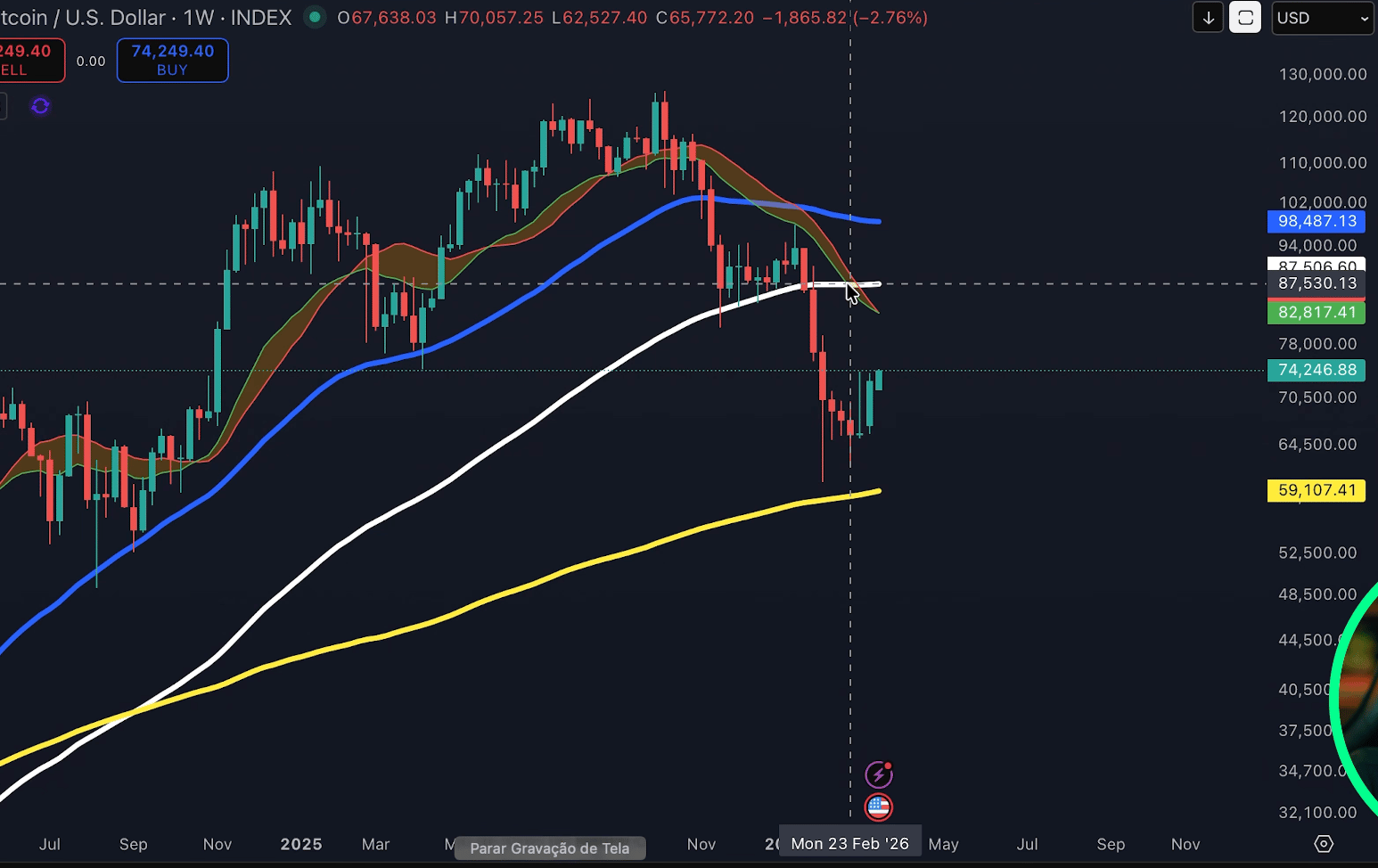 A resistência principal está em US$ 78.000, e a faixa de bull market hoje está em US$ 82.000. São essas as regiões que vão definir o próximo movimento.