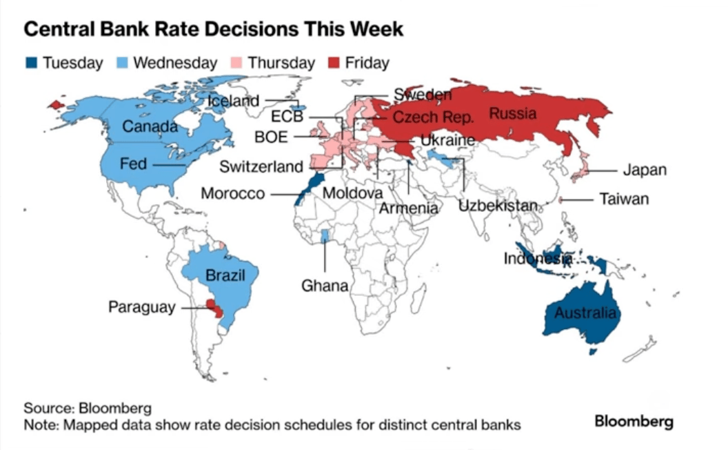 Essa semana tem decisões de política monetária em vários países: Brasil, Canadá, zona do euro e, principalmente, Estados Unidos.