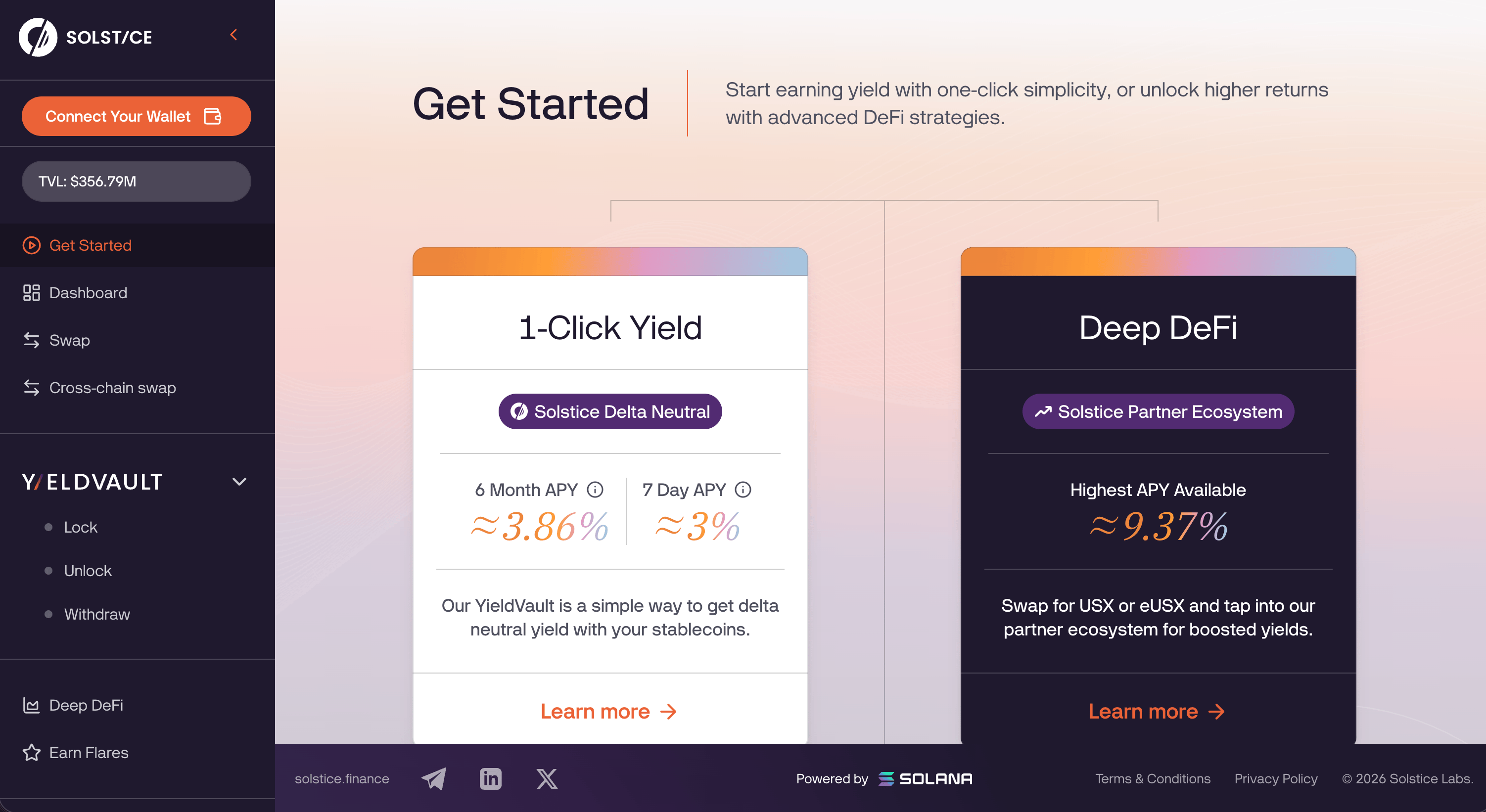 Solstice é um protocolo de stablecoin nativa na Solana. O $USX é a stablecoin da plataforma, totalmente colateralizada e gerando yield via estratégias delta-neutro.