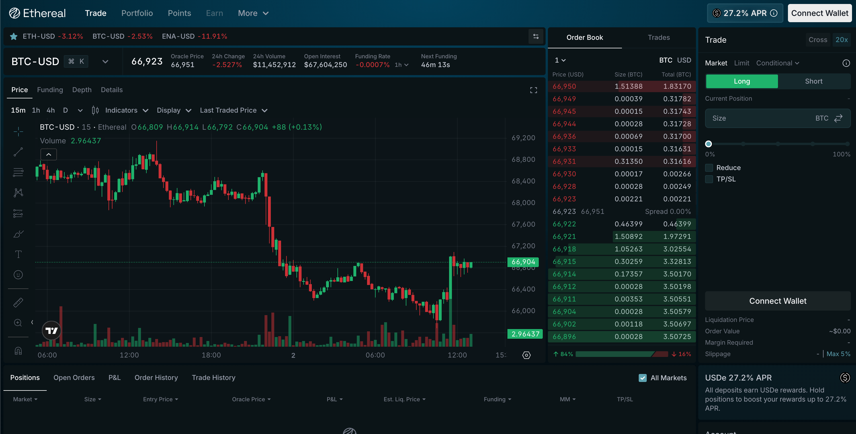 Ethereal é o principal DEX dentro do ecossistema Ethena. Você pode depositar stablecoins (que são automaticamente convertidas para USDe) e está rendendo mais de 20% ao ano, além de poder fazer trades de futuros para acumular mais pontos.