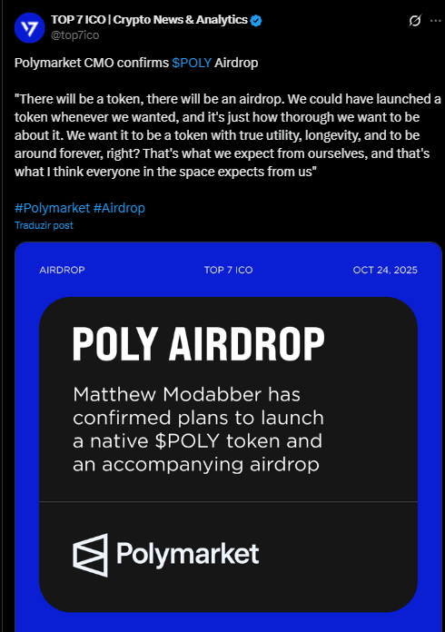 O CMO confirmou que haverá um airdrop do token $POLY. A última rodada de captação foi a US$ 9 bilhões de FDV, e o TVL atual é de apenas ~US$ 350M. Se o token lançar a US$ 10B FDV e airdropar 5% do supply, isso equivale a US$ 500M em tokens distribuídos. Potencialmente um dos maiores airdrops da história.