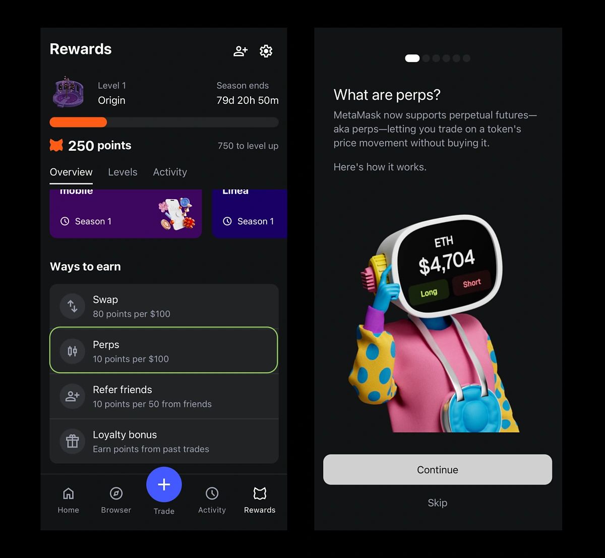 O MetaMask Rewards (programa de pontos) está ativo desde outubro de 2025, com Season 2 rodando agora.