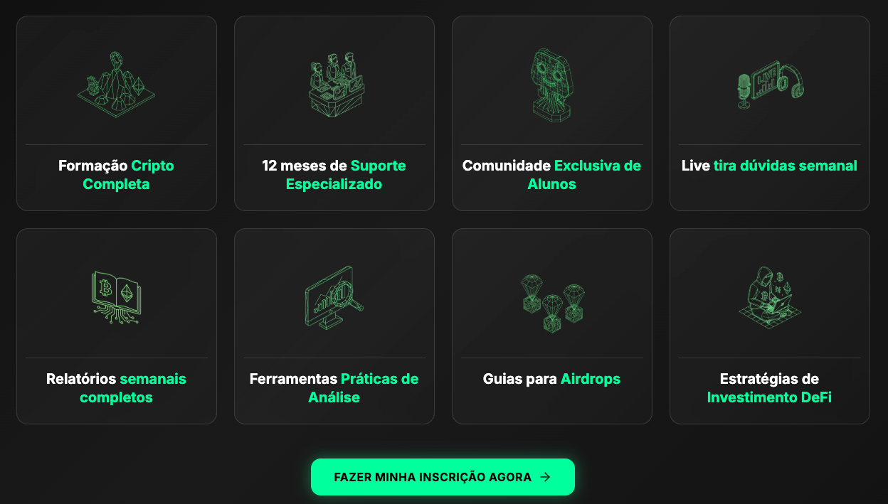 As vagas ficam abertas por tempo limitado, e as turmas só abrem a cada alguns meses, então essa é a sua oportunidade de aproveitar o melhor momento para investir no mercado cripto!