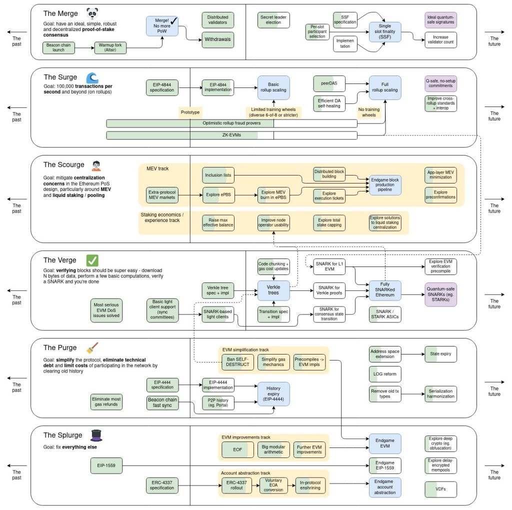 The Verge (2026-2027): implementação das Verkle trees, que comprimem o histórico da rede. O impacto prático é que um laptop comum poderá rodar um node completo sem precisar armazenar toda a história da blockchain.