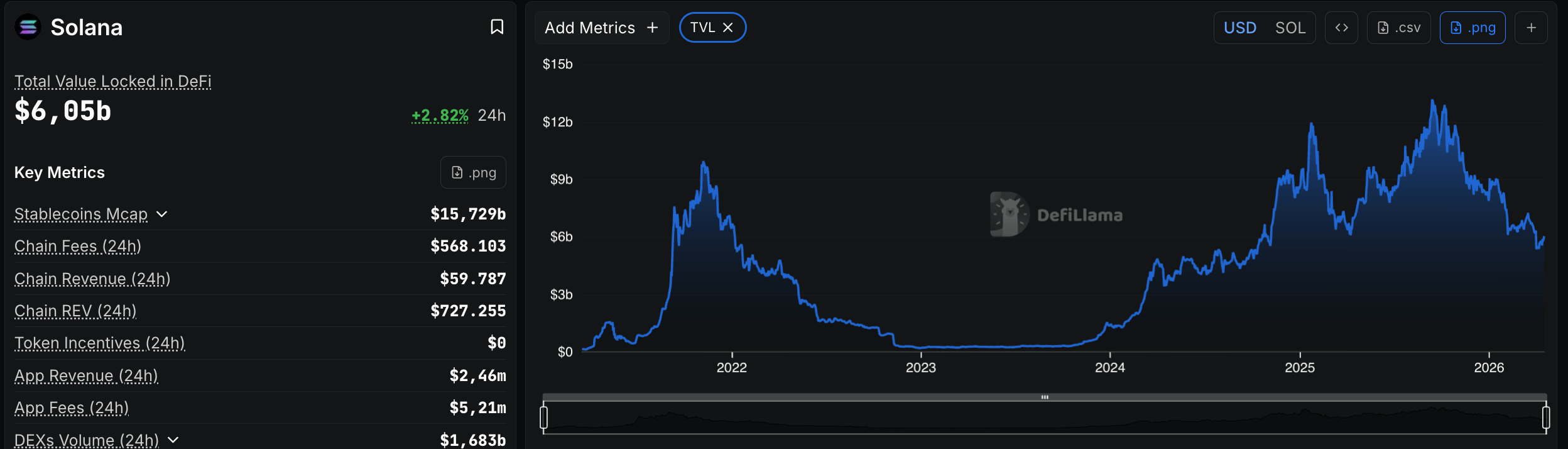 A Solana já processa em torno de 65 mil TPS, mas tem TVL de DeFi em torno de ~US$ 6 bilhões contra os ~US$ 55 bilhões da Ethereum (e mais US$ 40 bilhões em valor total securitizado quando somadas as L2s).