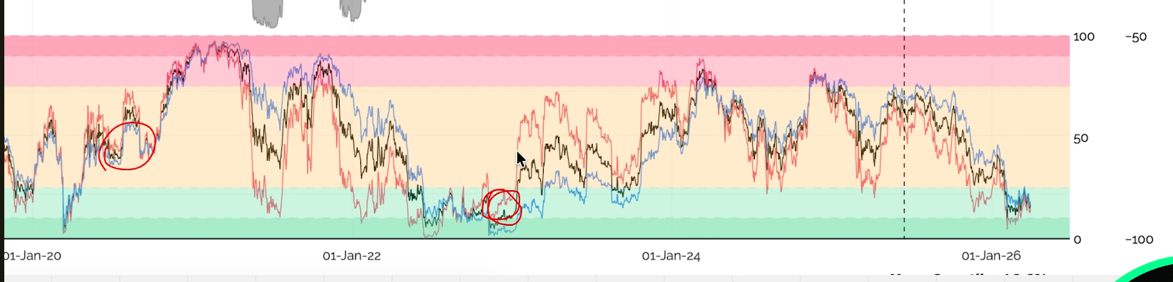 A linha vermelha ainda está abaixo da linha preta. Nos ciclos anteriores, quando esse cruzamento aconteceu, foi o momento em que o mercado de fato reverteu, no entanto, ainda não chegou lá.